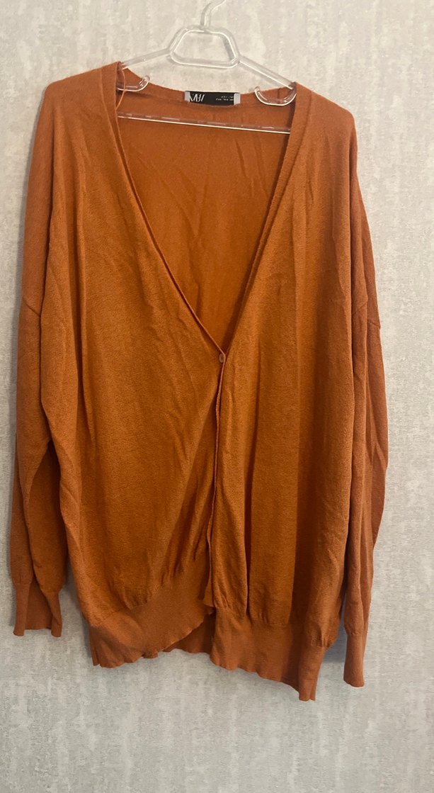 Uzun kollu, V yaka kahverengi salaş hırka. Yumuşak keten kumaştan, drapeli tasarıma ve midi boyuta sahip, günlük kullanım için uygundur.