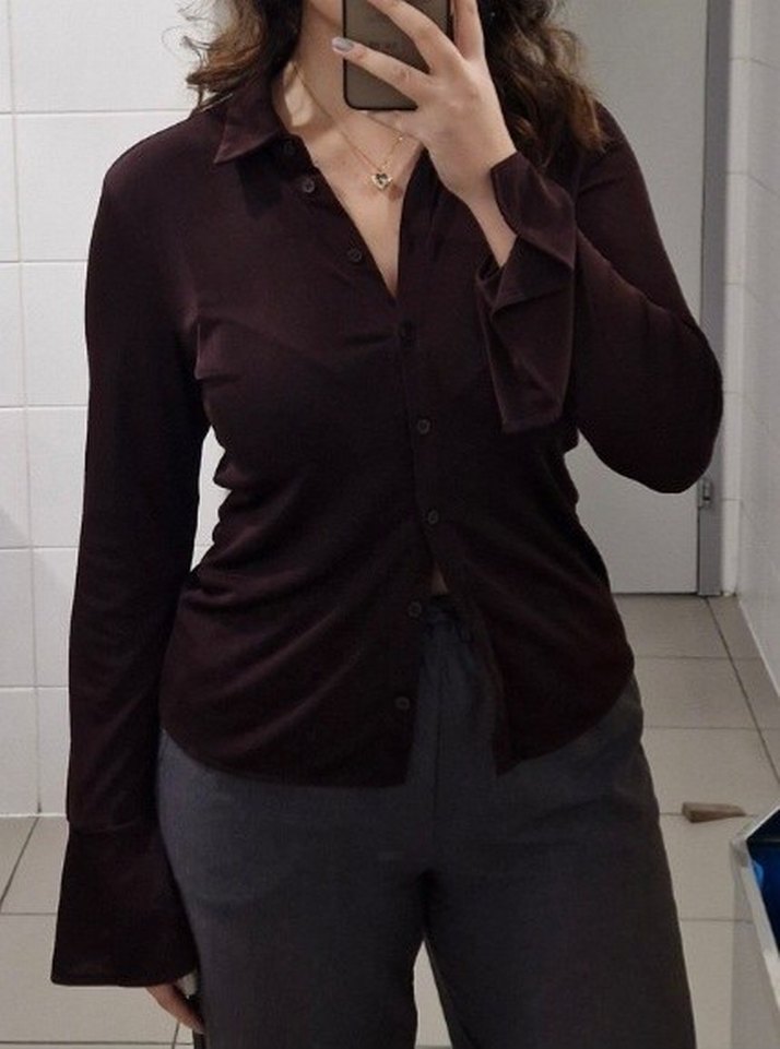 Kahverengi, ipeksi kumaştan, V yaka ve düğmeli uzun kollu, midi boy, kadın ofis gömleği. İş ortamına uygun, şık ve desen içermeyen tasarım.