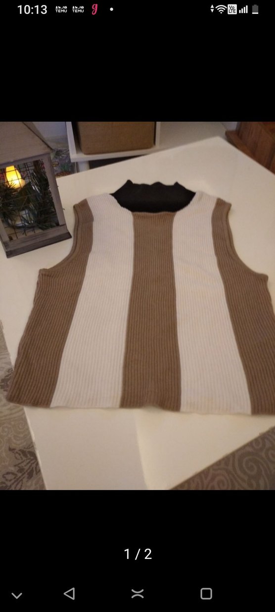Kadın kolsuz, boğazlı, triko kumaştan yapılmış, kahverengi ve krem dikey çizgili, normal midi boyda, sıkı kesim kazak. Rahat ve şık sokak stili için uygundur. Esnek balıkçı yaka kolsuz iki koltuk arası 31 cm omuzdan aşağı 37 cm 100/50 viskon 100/50 akrilik