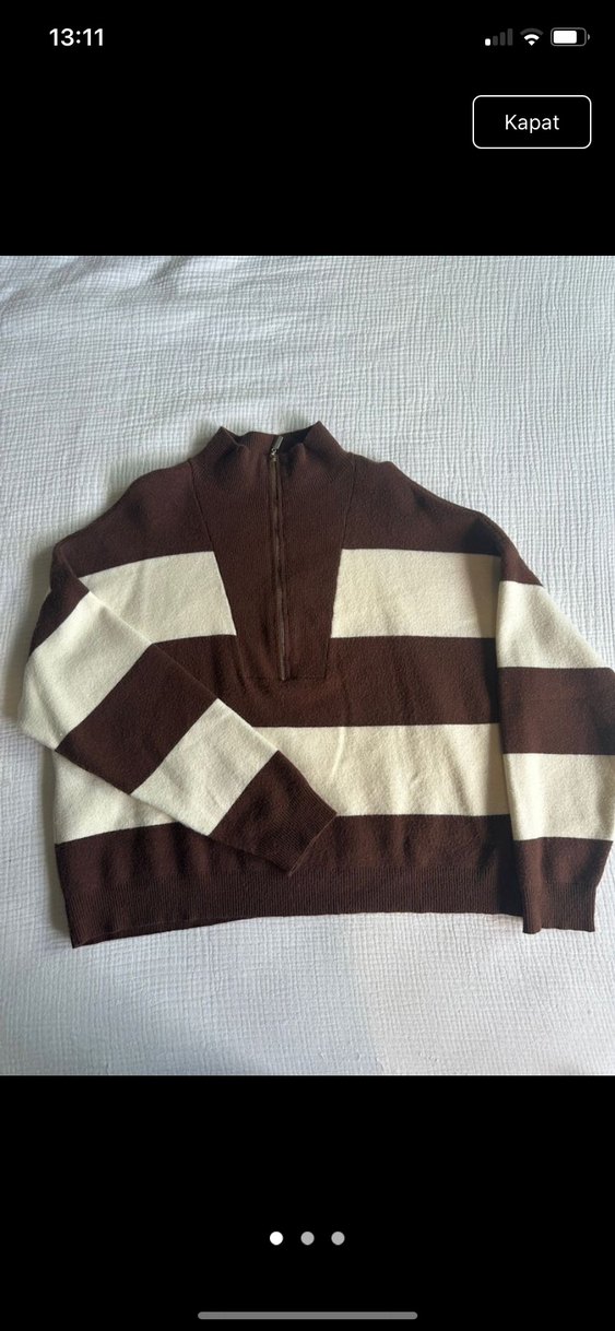 Kadınlar için yumuşak yün kumaştan örülmüş, yarım fermuarlı yüksek yakalı, uzun kollu ve bol kesim kahverengi ve krem renkli çizgili kazak.