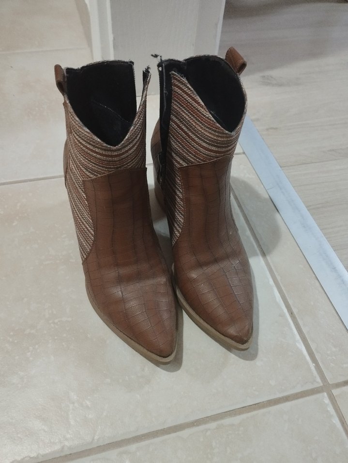 Kadın kahverengi deri dolgu topuk botlar, gri yılan derisi desenli ve tokalı detaylıdır, gündelik kullanıma uygundur.