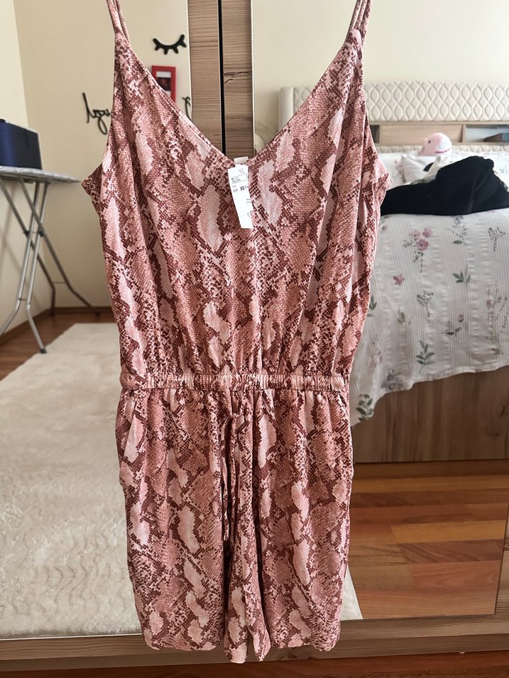 Kahverengi yılan desenli, dantel detaylı, v yaka, kolsuz, midi uzunlukta, bol kesim tulum. Yumuşak sentetik kumaştan, bohem tarzda, romantik akşamlar için uygun.