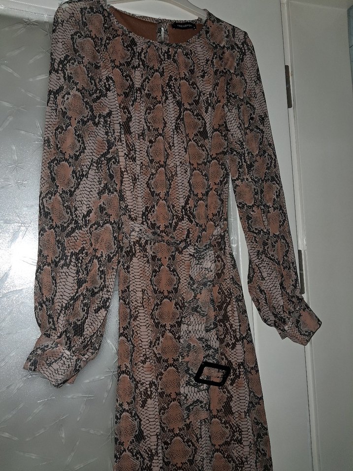 Kadın kahverengi yılan desenli midi elbise, balon ve uzun kollu. Kolları şifon. Kemerli, yuvarlak yaka, düz kesim elbise. Birkaç kez düğünde giydim tertemiz duruyor. Sadece en son fotoğraftaki gibi kolunun dikiş yerinde bir sökük mevcut terzide ya da elde dikerek rahatlıkla halledilir.