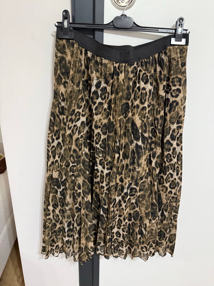 Kadınlar için kahverengi yılan desenli pilili midi etek. Sentetik kumaştan, bol kesim ve sokak modasına uygun, dış mekan kullanımı için ideal.