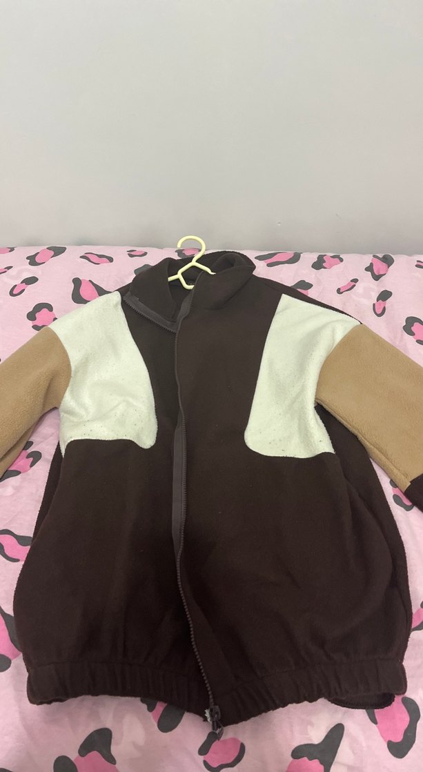 Kadın ceket, yüksek yakalı ve uzun kollu, bol kesimdir. Fermuarlı ön kısmı ve kahverengi-bej renk kombiniyle sokak tarzı sağlar.