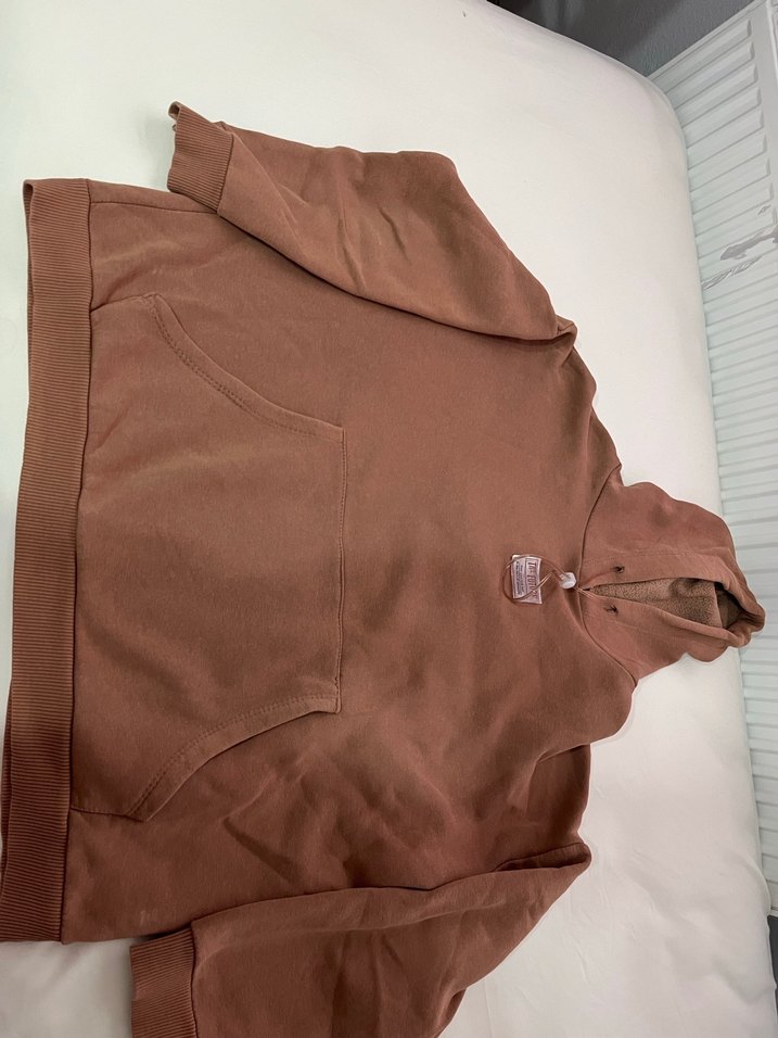 Yumuşak ve sıcak kumaştan yapılmış, yüksek yakalı ve uzun kollu kahverengi sweatshirt. Rahat kesimli ve ön cep detaylı, günlük kullanım için uygundur.
