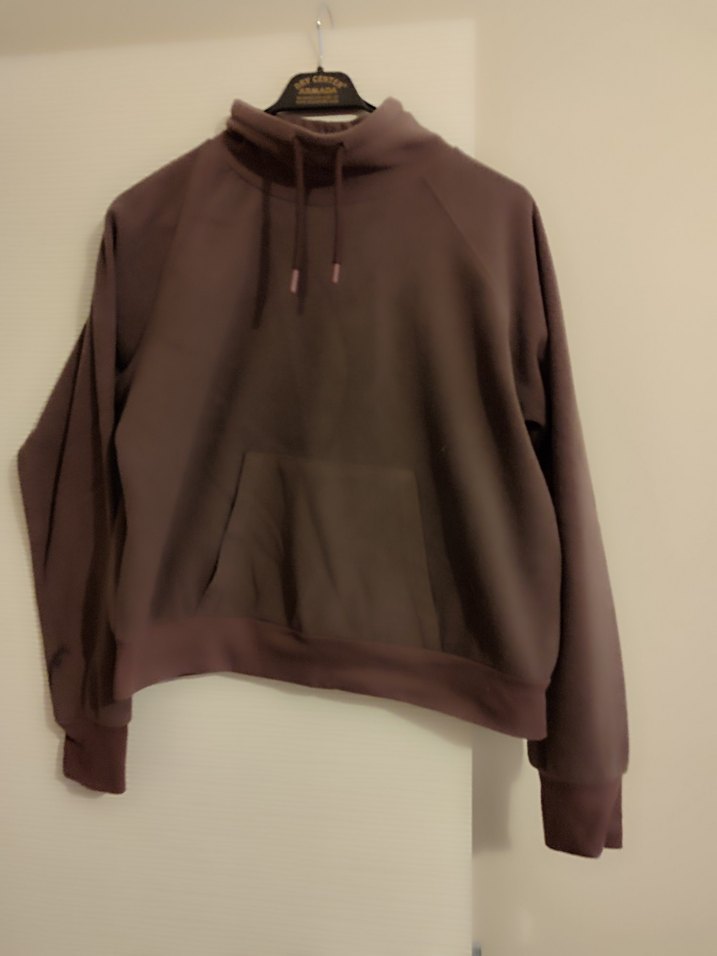 Kadın kahverengi sweatshirt, yüksek yakalı ve uzun kolludur. Yumuşak ve sıcak kumaştan, rahat kesimle günlük ve sokak stiline uygundur.