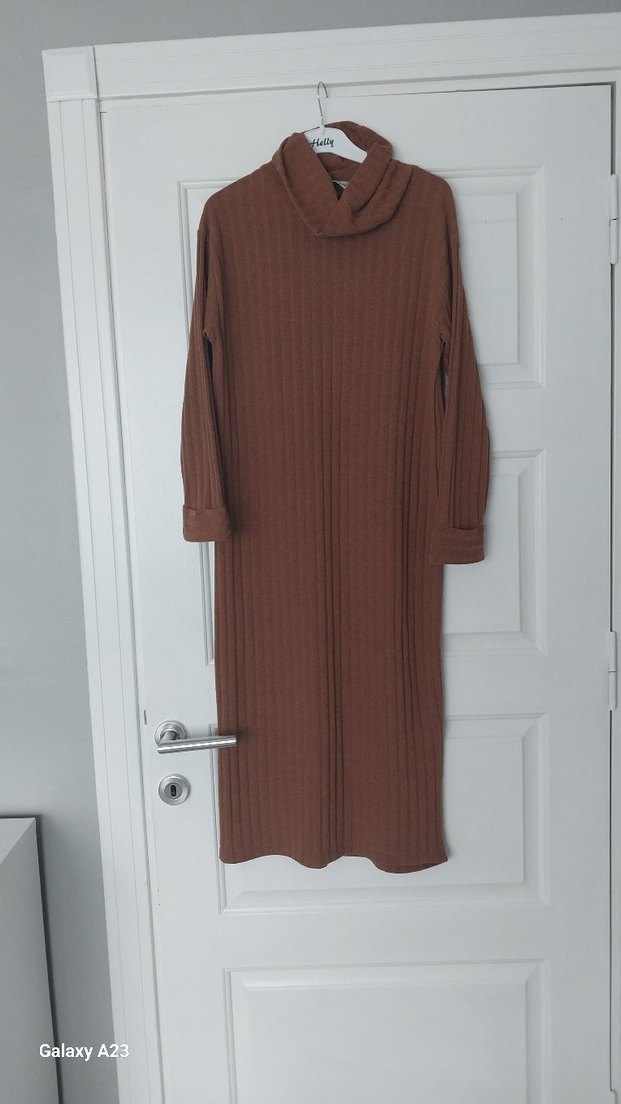 Yüksek yakalı, uzun kollu, bol kesim kadın elbisesi. Yumuşak yün kumaştan, kahverengi ve triko dokulu, rahat günlük kullanım için uygundur. 40 beden