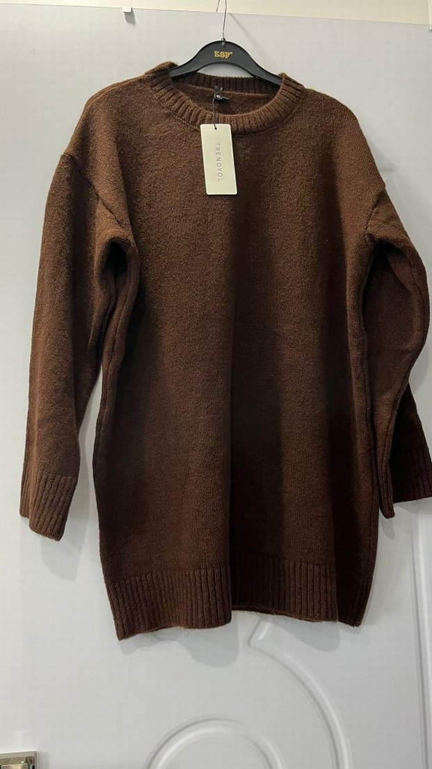 Kadın kahverengi yün kazak, yuvarlak yaka ve uzun kolludur. Salaş ve normal boyda, desensizdir, günlük kullanıma uygundur.