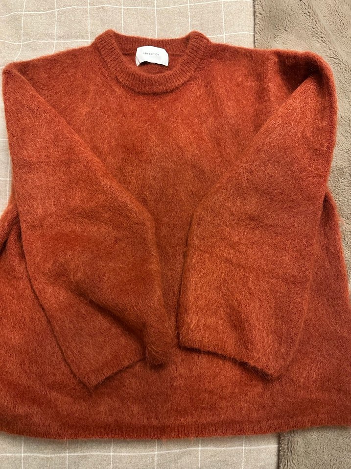 Kahverengi, yün örme, yuvarlak yakalı, uzun kollu, bol kesim ve normal boyda kadın kazak. Günlük kullanıma uygundur.