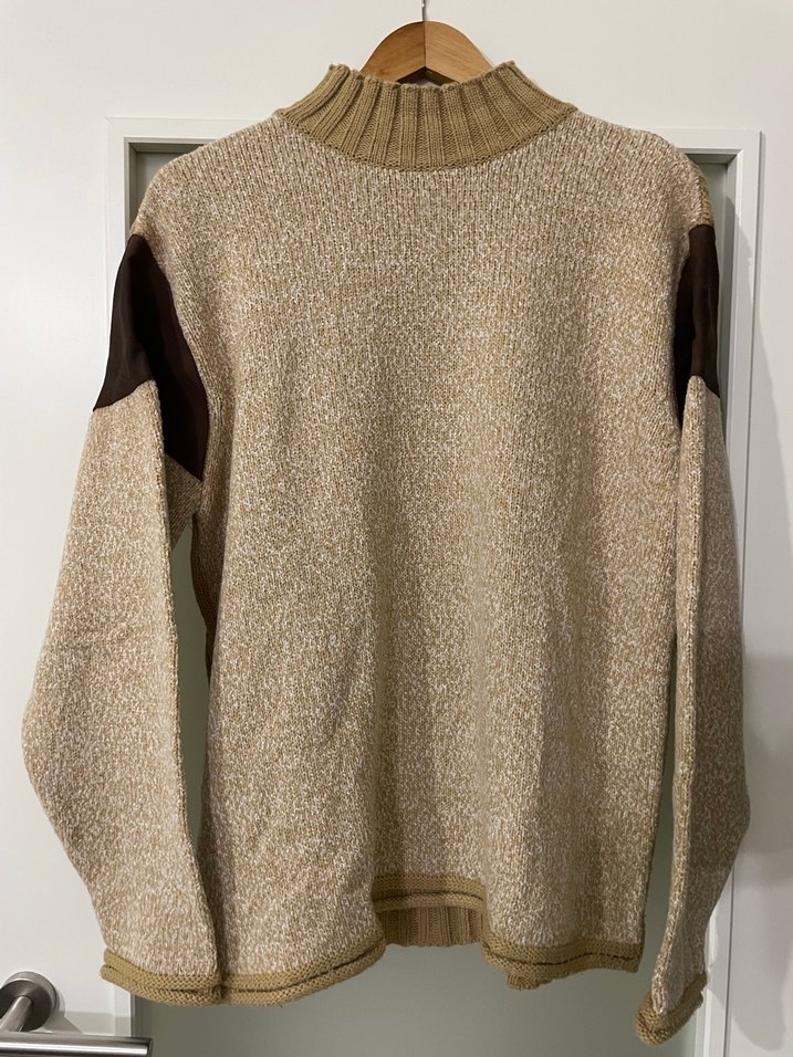 Kadın kahverengi yün örgü kumaştan, gri detaylı kol parçalı kazak. Yüksek yakalı, uzun kollu ve bol kesimdir. Günlük rahat sokak stiline uygundur.