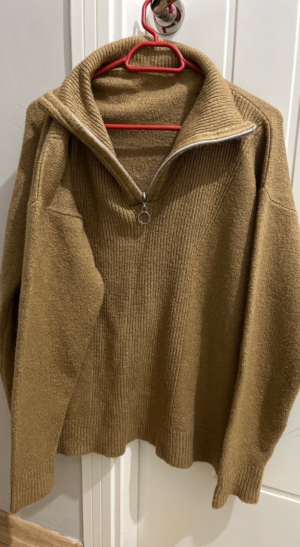 Kadınlar için yumuşak yünden, yarım fermuarlı yüksek yakalı, bol kesim kahverengi kazak. Uzun kollu ve örme dokulu, gündelik kullanıma uygun.