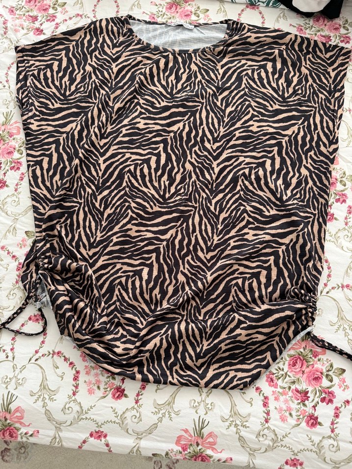 Kahverengi zebra desenli, bol kesim, kayık yaka ve fırfırlı kadın bluzu. Yumuşak sentetik kumaştan, askılı kollu ve midi boyda, açık hava kullanımı için uygun.