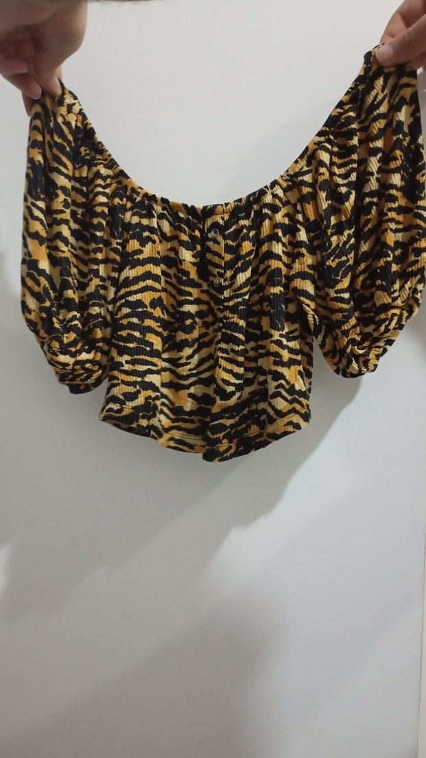 Kadınlar için kayık yaka, bol kesim, pileli ve askılı kollara sahip kısa bluz. Koyu kahverengi zebra deseniyle bohem ve retro tarzda, açık hava etkinliklerine uygun.