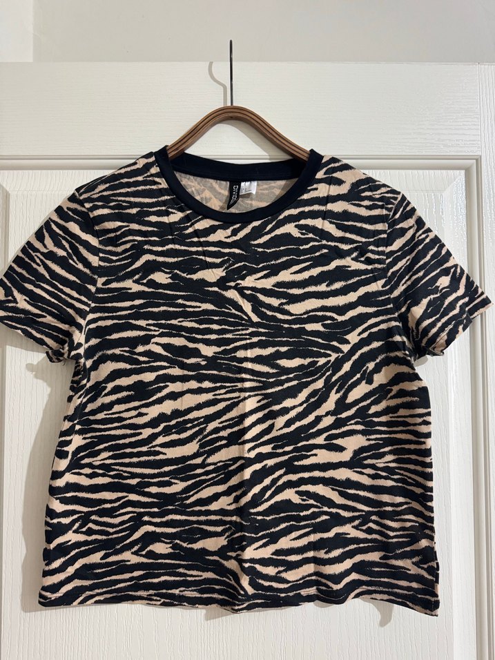 Kahverengi zebra desenli, kısa kollu, bisiklet yaka, vücuda oturan kadın tişörtü. Tekstil malzemeden, günlük kullanım için uygun sokak stili.