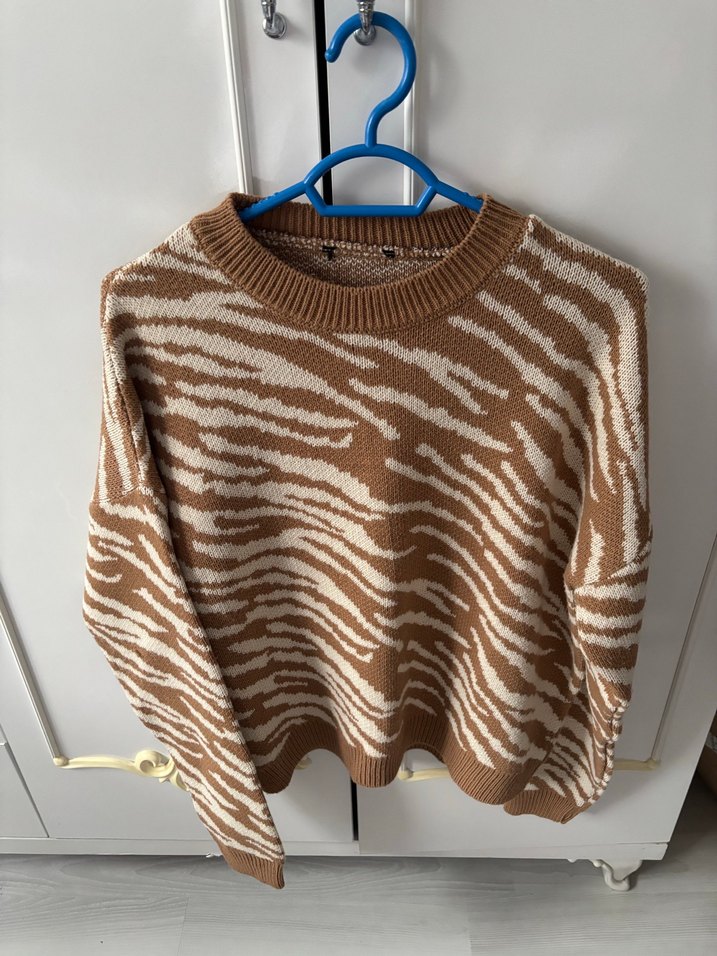 Kadın kahverengi zebra desenli triko kazak, uzun kollu ve yuvarlak yakalıdır. Bol kesim ve yumuşak dokulu örme kumaştan yapılmıştır, günlük ve rahat sokak stiline uygundur.