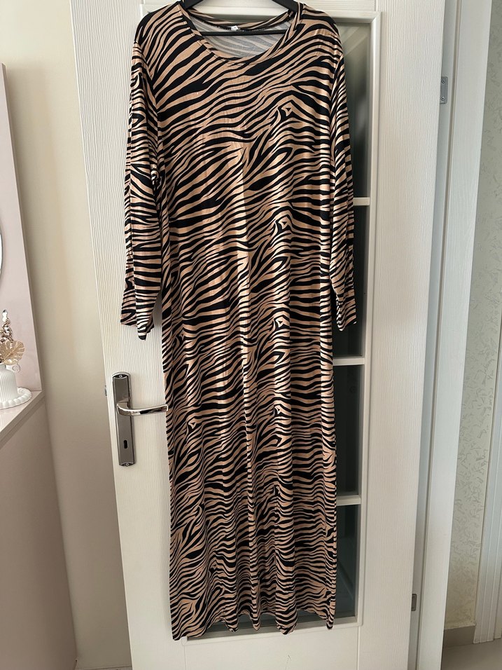 Hiç giyilmedi Standart beden penye zebra desen Kadın kahverengi zebra desenli uzun elbise, uzun kollu ve tekne yaka. Rahat kesim, pileli detaylı ve sentetik kumaştan, günlük ve sokak stiline uygun.
