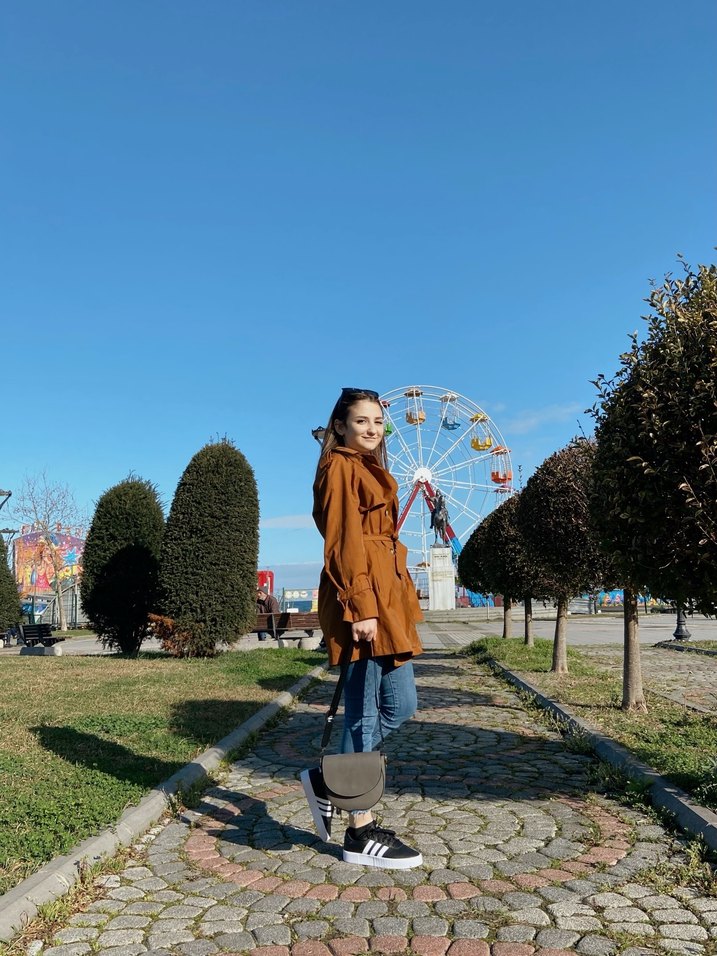 Düğmeli, uzun kollu, normal uzunlukta ve bol kesim kadın trençkot. Minimalist sokak stili için uygundur.
