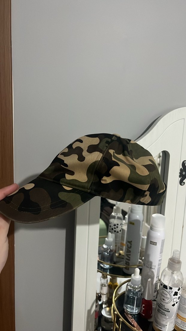 Kadınlar için kamuflaj desenli, koyu haki renkli, ayarlanabilir velcro bantlı şapka. Plastik malzemeden yapılmış, rock punk havası ve minimalist tarz için uygun.