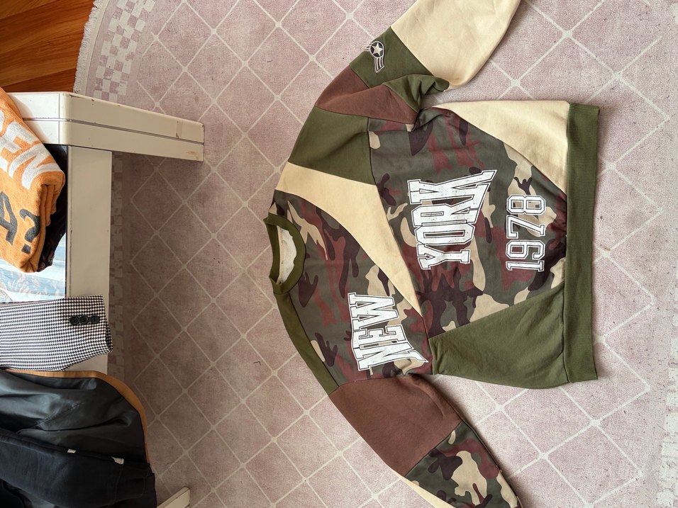 Kadın sweatshirt, kamuflaj desenli, yuvarlak yaka ve uzun kollu. Rahat kesim, fermuarlı, tekstil malzemeden, koyu kahverengi tonlarında, günlük kullanıma uygun.