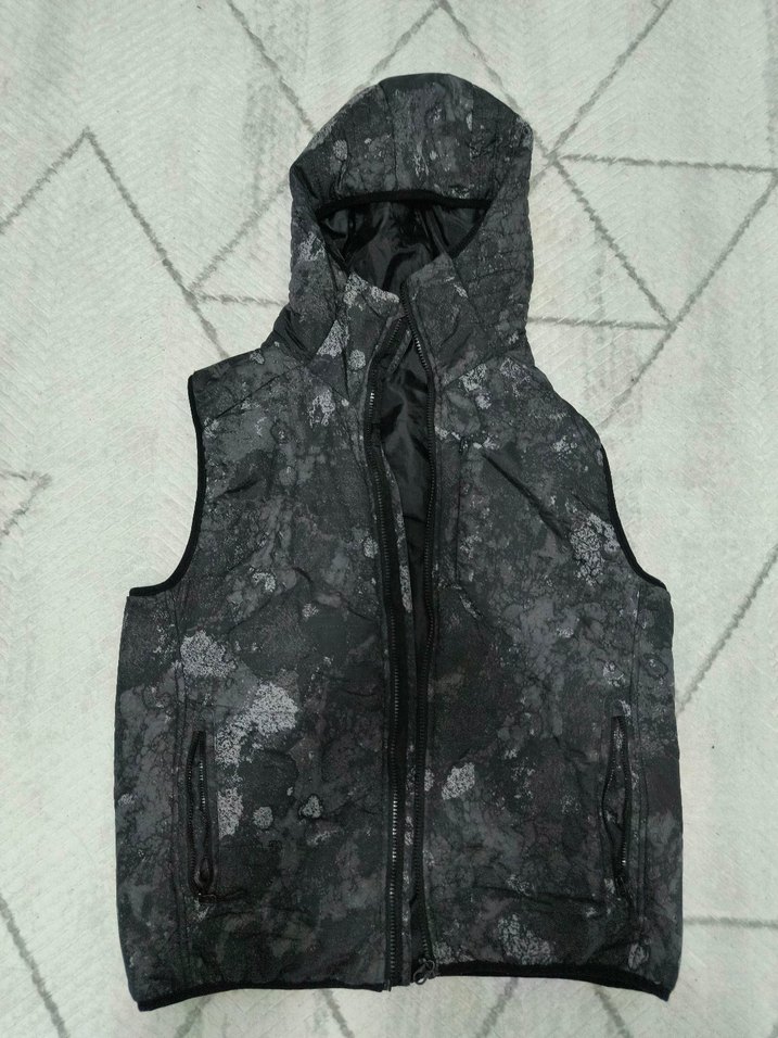 Yüksek yakalı, fermuarlı, kamuflaj desenli, gri renkte kolsuz kadın yeleği. Yumuşak ve sıcak kumaştan, midi boy