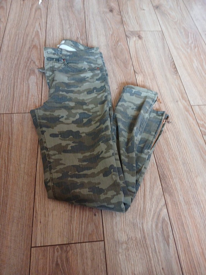 kamuflaj desenli, fermuarlı detaylara sahip bol kesim kadın kot pantolon. Rahat ve günlük sokak tarzına uygun. ebatlar bel 34 basen 90