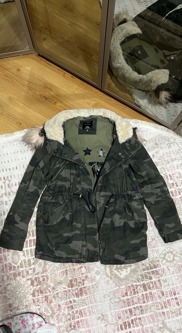 Kadınlar için kamuflaj desenli, kürklü yakalı, orta boy ve dar kesim kışlık mont. Yumuşak ve sıcak fleece kumaştan, uzun kollu ve notched lapel yakalı, dış mekan için uygun. yepyeni duruyor hiç bir yerinde sorun yoktur. iç kısmında kolunuza asmak için askısıda vardır öylelikle taşıyabiliyorsunuz