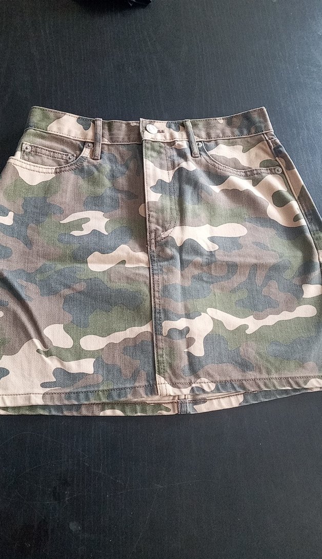 Kadınlar için kamuflaj desenli, bol kesim midi kot etek. Kahverengi ve gri tonlarda, rahat ve şık bir sokak stili sunar. bel 34 boy 38 cm