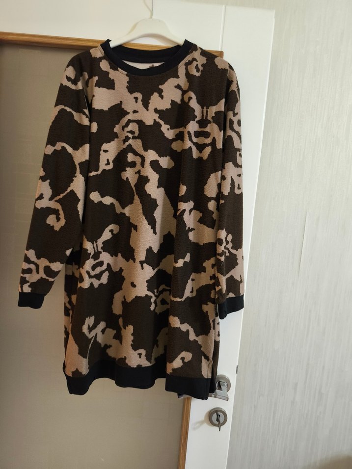 Kadınlar için, uzun kollu, bisiklet yaka, kamuflaj desenli, koyu kahverengi, sentetik kumaştan, salaş kesim midi tunik. Günlük sokak stili için drapeli tasarım.
