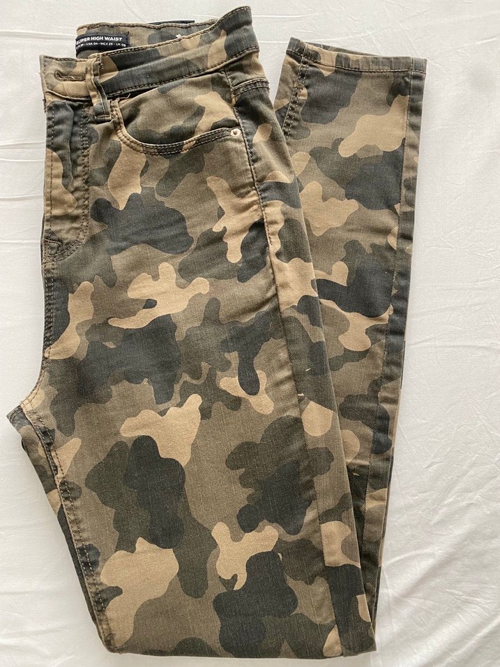 Düğmeli, kahverengi yeşil kamuflaj desenli, kot kumaştan, rahat kesim ve midi boy kadın pantolon. Sokak stili için uygun.