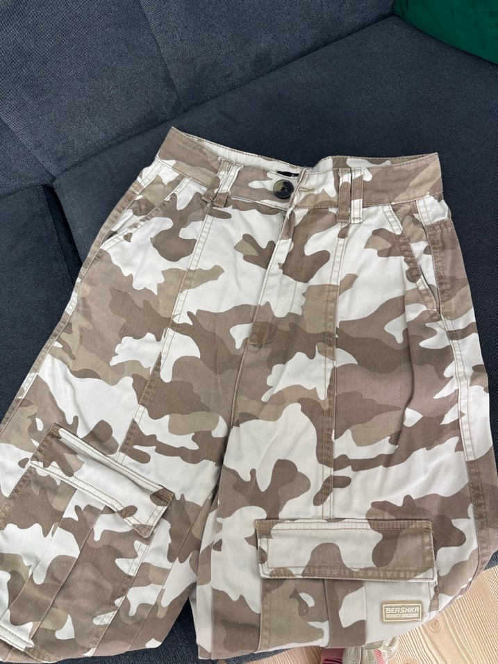 Kahverengi ve kamuflaj desenli, kemerli ve midi boy rahat kesim kadın pantolonu. Sentetik kumaştan, sokak stili ve açık hava için uygundur. ️