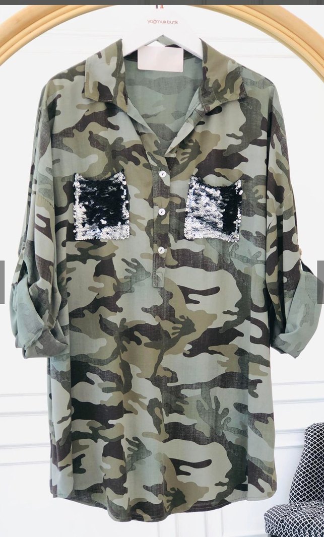 Uzun kol, bol kesim kadın gömlek. Kamuflaj desenli, V yaka ve düğmeli. Payet ceplerle sokak stili için uygun, dış mekan kullanımı için ideal.
