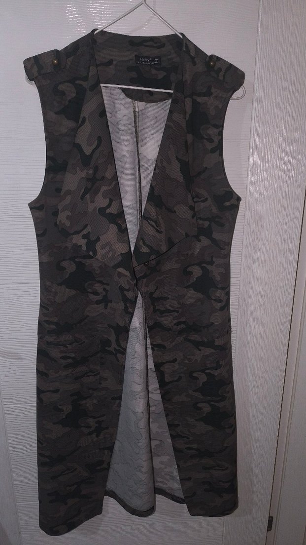 Kadınlar için kamuflaj desenli, uzun ve kemerli, kolsuz yelek. Notlu yakası ve sentetik kumaşıyla sokak stili için uygundur.