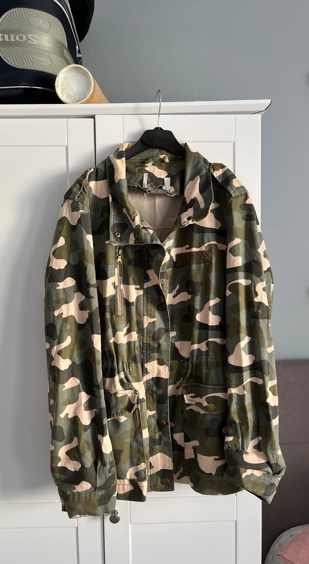 Gri ve haki tonlarında kamuflaj desenli, düğmeli, notched yaka kadın ceket. Rahat kalıp ve sokak stili ve dış mekan kullanımı için uygun.