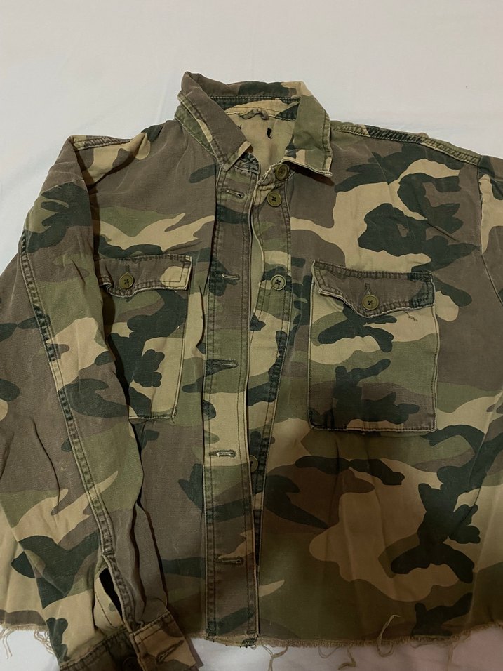 Kadın kamuflaj desenli, düğmeli, uzun kollu ve normal boyda, salaş kesim bir ceket. Notched lapel yaka ve sokak modası tarzında, dış mekan kullanımı için uygundur.