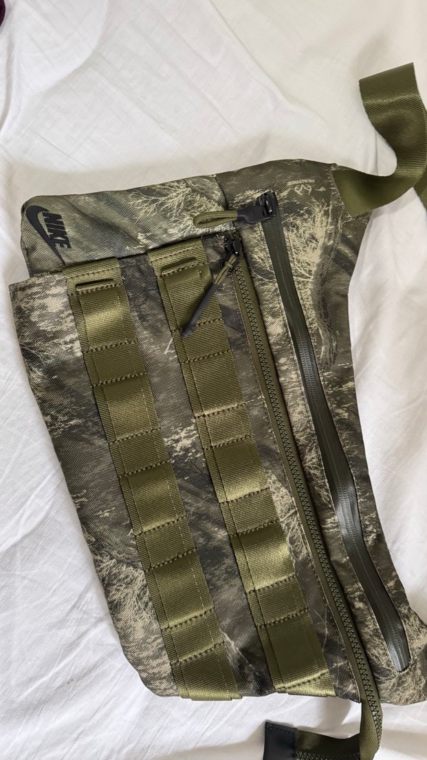 Kadın bel çantası, fermuarlı, gri kamuflaj deseni ve haki askılarıyla sokak stili ve athleisure tarzını birleştiriyor.