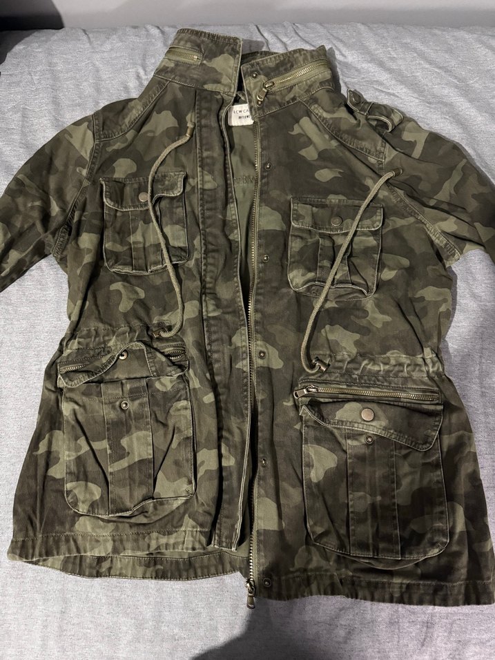 Kadınlar için kamuflaj desenli, fermuarlı ve bol kesim midi ceket. Uzun kollu, cepli ve notched yaka detaylı, dış mekan kullanımı için uygun koyu yeşil tonlarda.