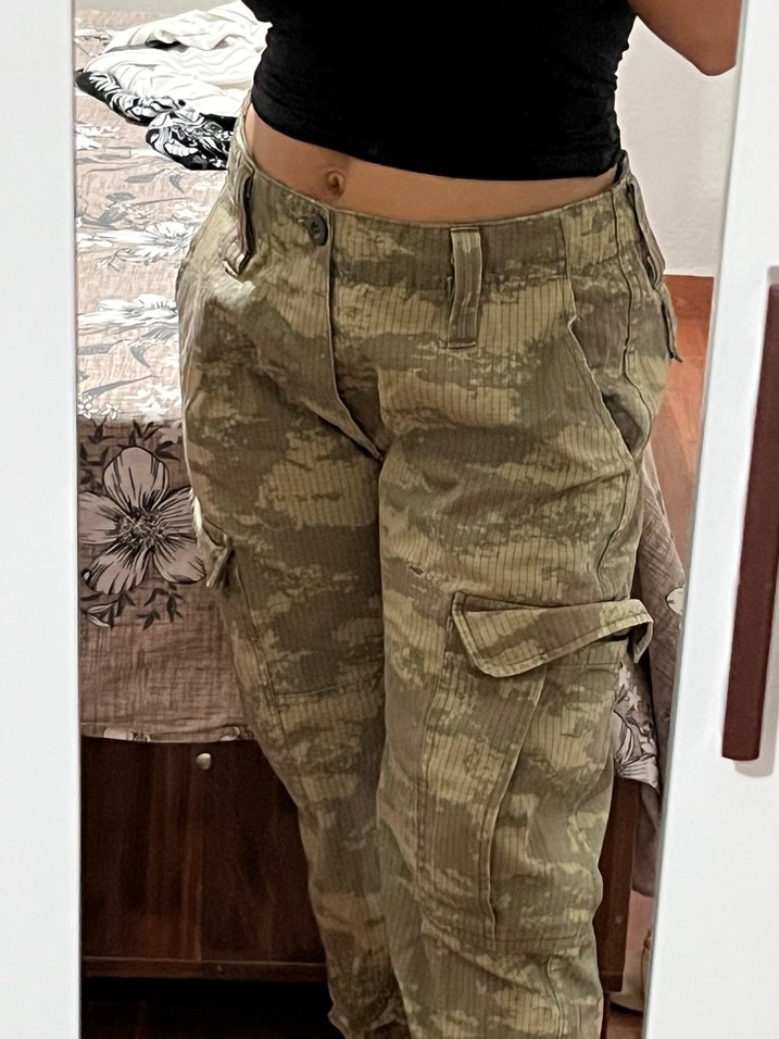 Kadınlar için kamuflaj desenli, kemerli ve salaş kesime sahip, kahverengi ve gri tonlarında sentetik kumaştan yapılmış pantolon. Sokak stiline uygun, açık hava kullanımı için ideal. ️