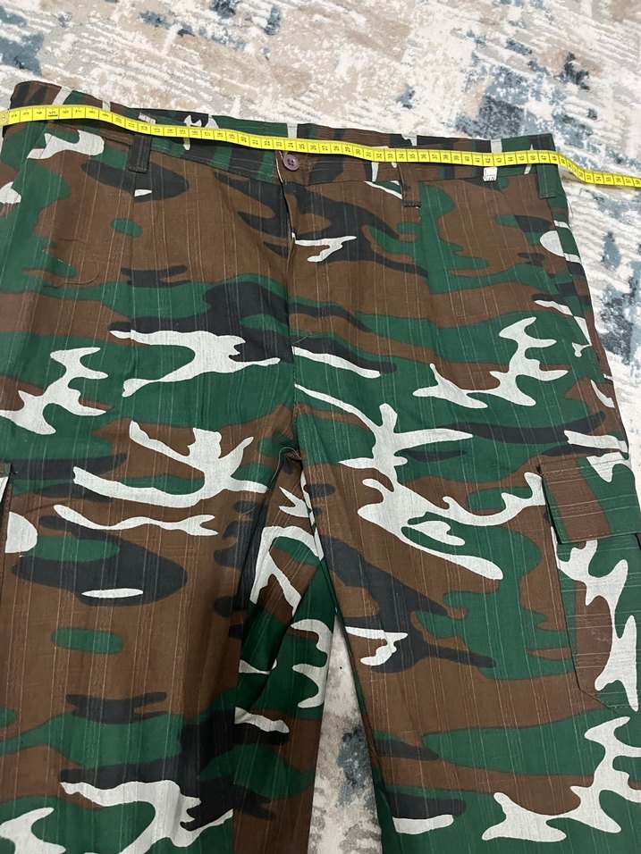 Kadınlar için kamuflaj desenli, kemerli ve rahat kesime sahip sentetik kumaş pantolon. Normal midi boyda, dış mekan ve sokak stili için uygundur.