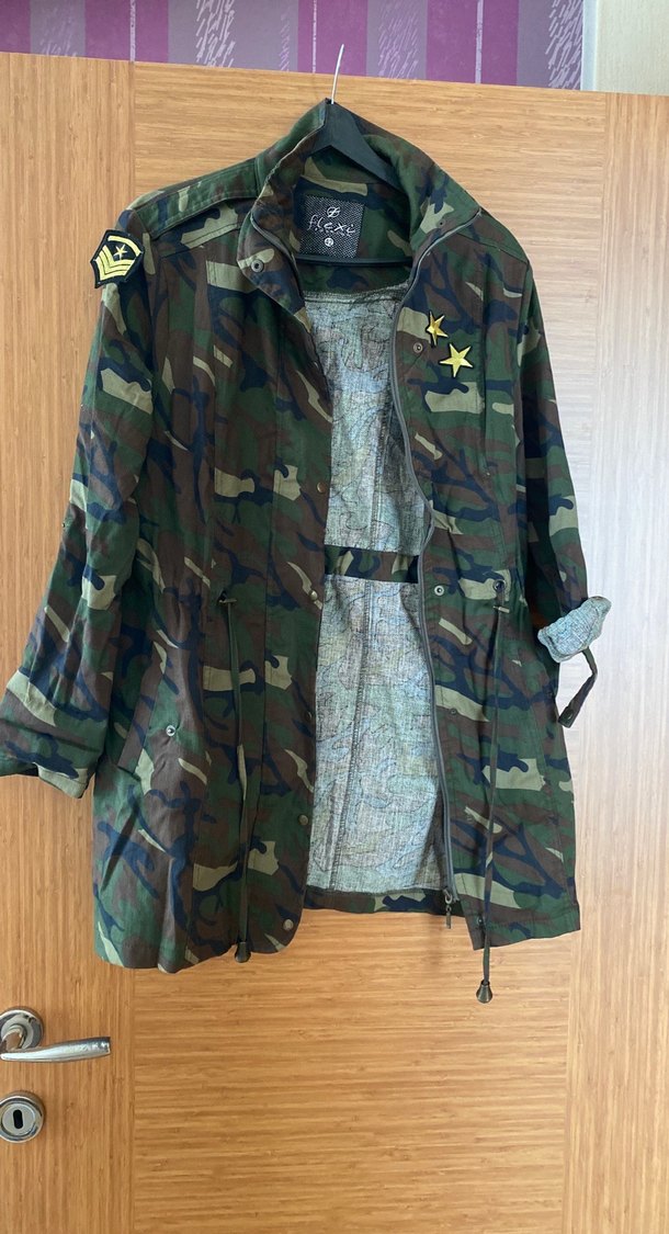Kadınlar için kamuflaj desenli, düğmeli, notched lapel yakalı, uzun kollu, bol kesim midi ceket. Outdoor sokak stili için uygun. Not satılan ürünlerin parasını 20 aylık kızıma veriyorum