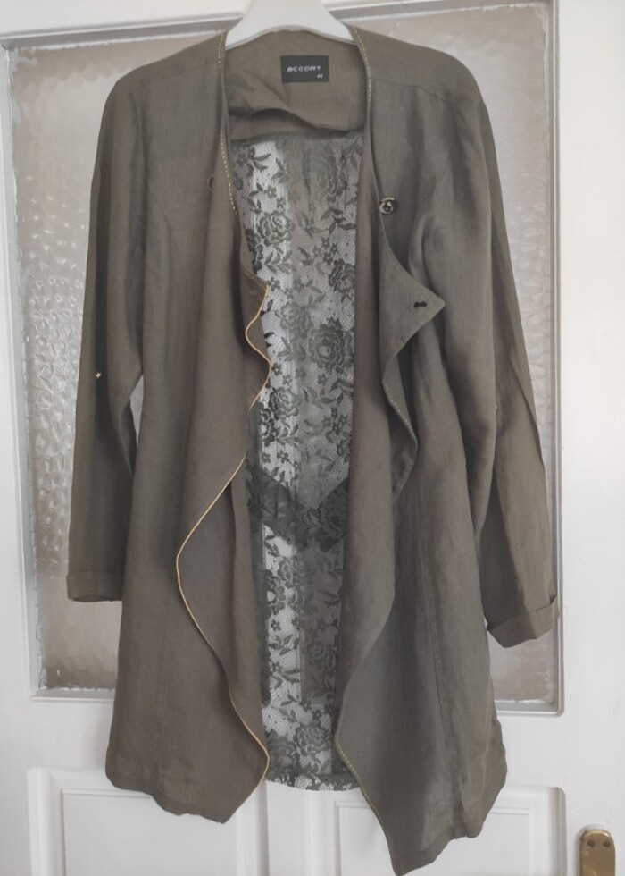 Yeni cok ama cok iyi durumda harika bir keten kumaşı ve harika bir modeli vardir ister önü açık ister kapali giyilebilen istenilen yöne iliklenebilen net haki yeşilidir arka detayi dantel olan accort marka şahane bir ceket kaptır fazlaliktan satıştadır kollarinda kıvırma aparatı vardir kıvırıp kullanılabilir marka accort uygulamada çıkmadı