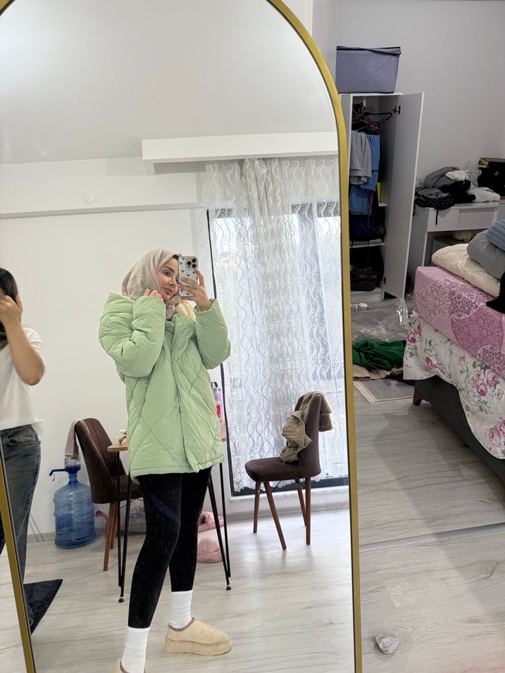 Kadınlar için kapitone midi kaban, yüksek yakalı ve uzun puff kollu bol kesimdir. Haki pastel renk ve yumuşak kumaşıyla sıcak ve rahatlık sağlar, günlük sokak stili için uygundur.