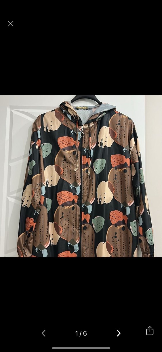 Kadınlar için kapüşonlu, uzun kollu, bol kesim yağmurluk. Koyu kahverengi tonlarında canlı batik desenli, düğmeli, sentetik kumaştan yapılmıştır. Kısa boyu ve sokak stili bohem tarzı yansıtır. ️ #yağmurlu #tunik #tesettür #trenç