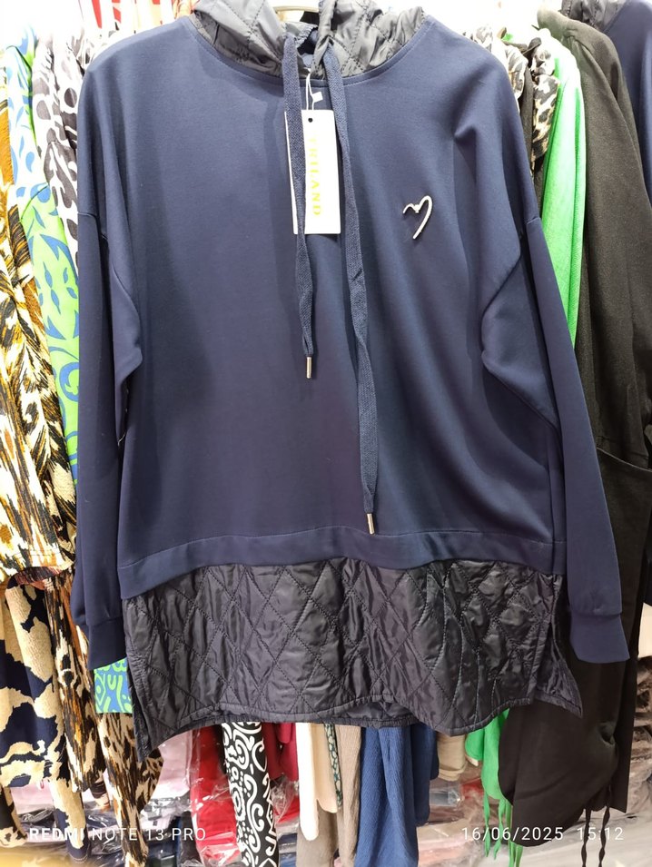 terleme tüylenme yapmaz Kadınlar için kapüşonlu, uzun kollu, fermuarlı ve bol kesim koyu mavi sweatshirt. Baskılı ve mini uzunlukta kapitone detaylı, günlük rahat kullanım için uygundur.