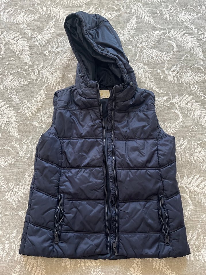 Lacivert renkli, kapüşonlu ve fermuarlı cepli şişme yelek. Yumuşak fleece kumaştan, normal boyda ve dar kesimdir. Normalde Medium beden giyiyorum fakat bunun bedeni large Medium beden giyen birine gayet iyi olur
