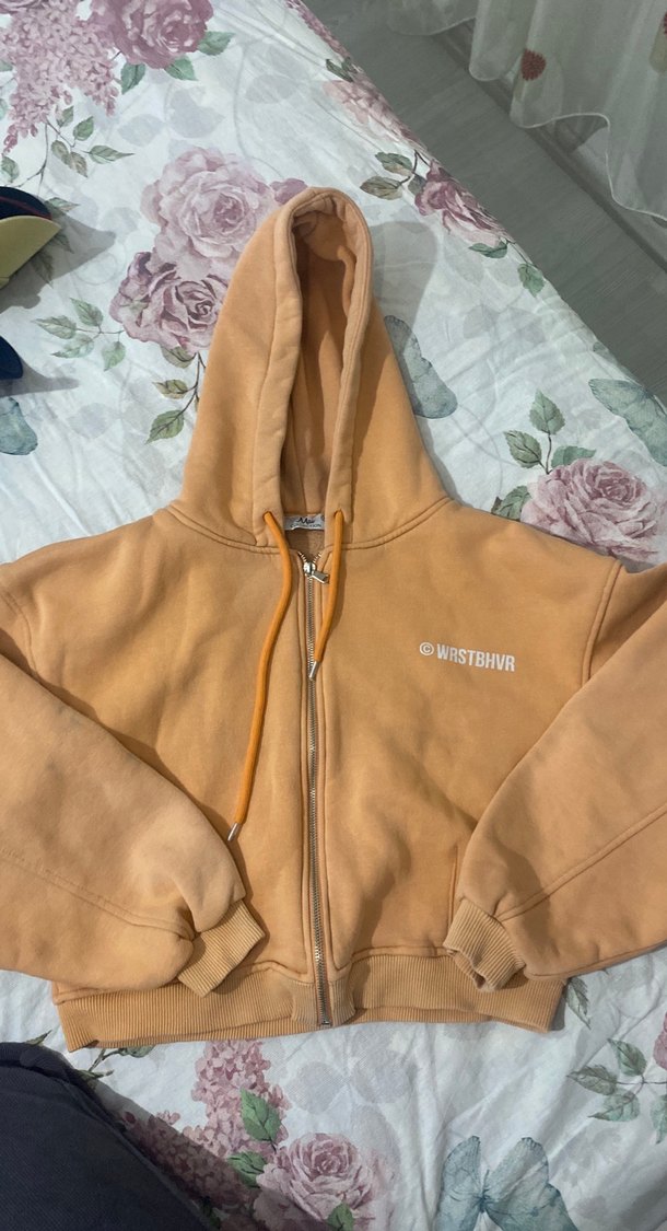 Yumuşak ve sıcak kumaştan yapılmış, kapüşonlu ve uzun kollu pastel kahverengi fermuarlı bol kesim sweatshirt. "WRSTBHVR" yazılı sade tasarıma ve ribanalı manşetlere sahiptir. rengi şeftali rengi normalde ışıkta kamerada görünmüyor isteyene atarım