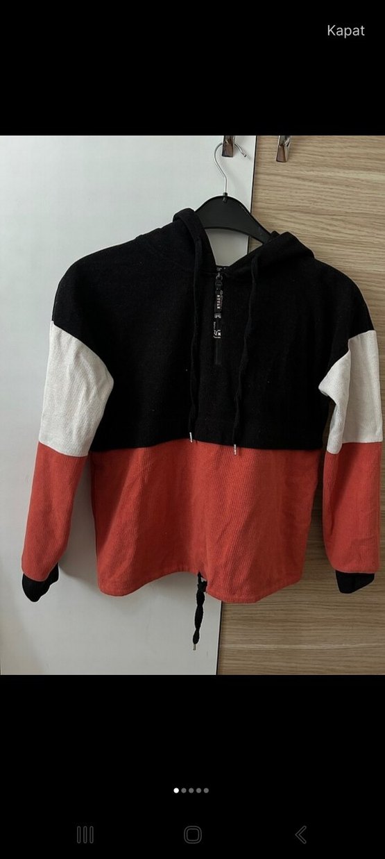 Kadın kapüşonlu, fermuarlı sweatshirt uzun kollu ve bol kesimdir. Siyah, beyaz ve kırmızı renk bloklu, yumuşak ve sıcak kumaştan üretilmiştir.