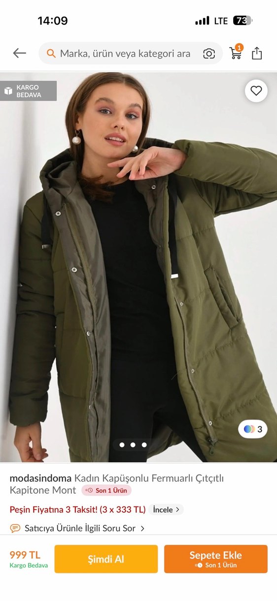 Kadın kapüşonlu, düğmeli kapitone mont. Haki renkte, uzun kollu ve bol kesimdir. Günlük kullanıma uygun sentetik kumaştan üretilmiştir.