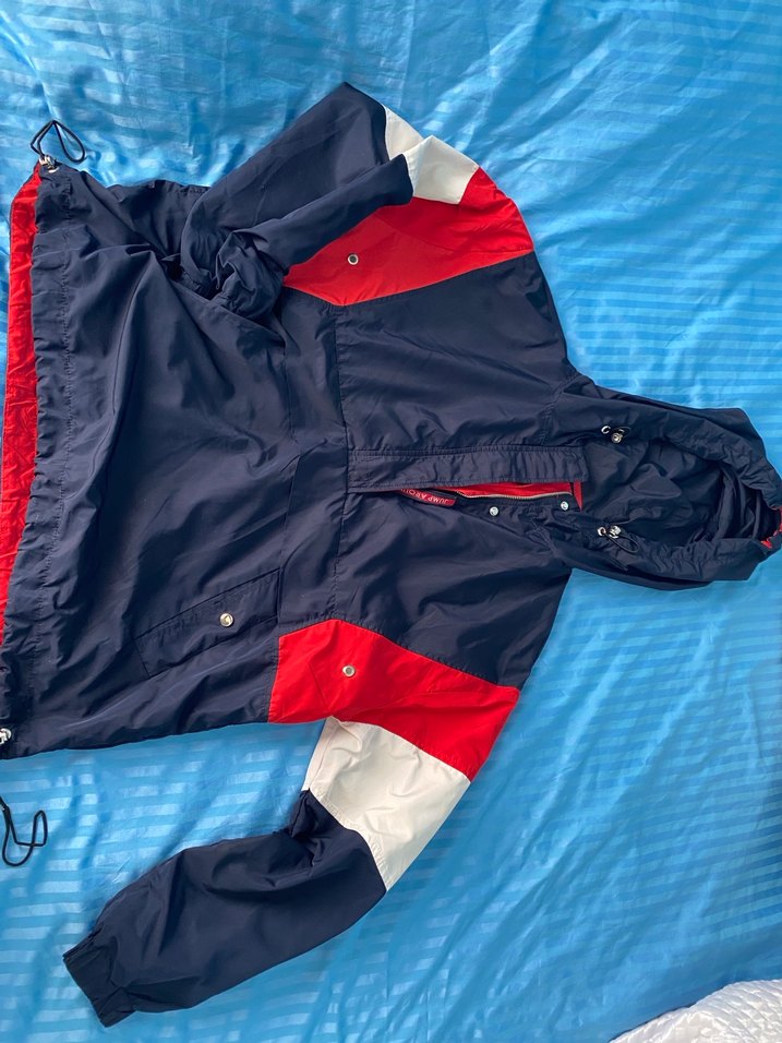 Kadın kapüşonlu rüzgarlık, fermuarlı ve bol kesimdir. Uzun kollu, mavi üzerine kırmızı ve beyaz detaylı, yumuşak ve sıcak kumaştan yapılmıştır. Alt lastikleri gevşemiştir değiştirmeyle kullanımda bir sıkıntı olmaz