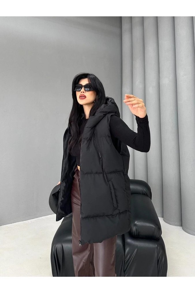 Siyah, kapüşonlu ve yüksek yakalı, regular fit kadın yelek. Sentetik kumaştan, midi boyda ve kolsuz tasarım. Rahat sokak stili için ideal.